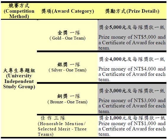 1.    大專院校組:鼓勵學生以團隊方式發表研究或創新專題。